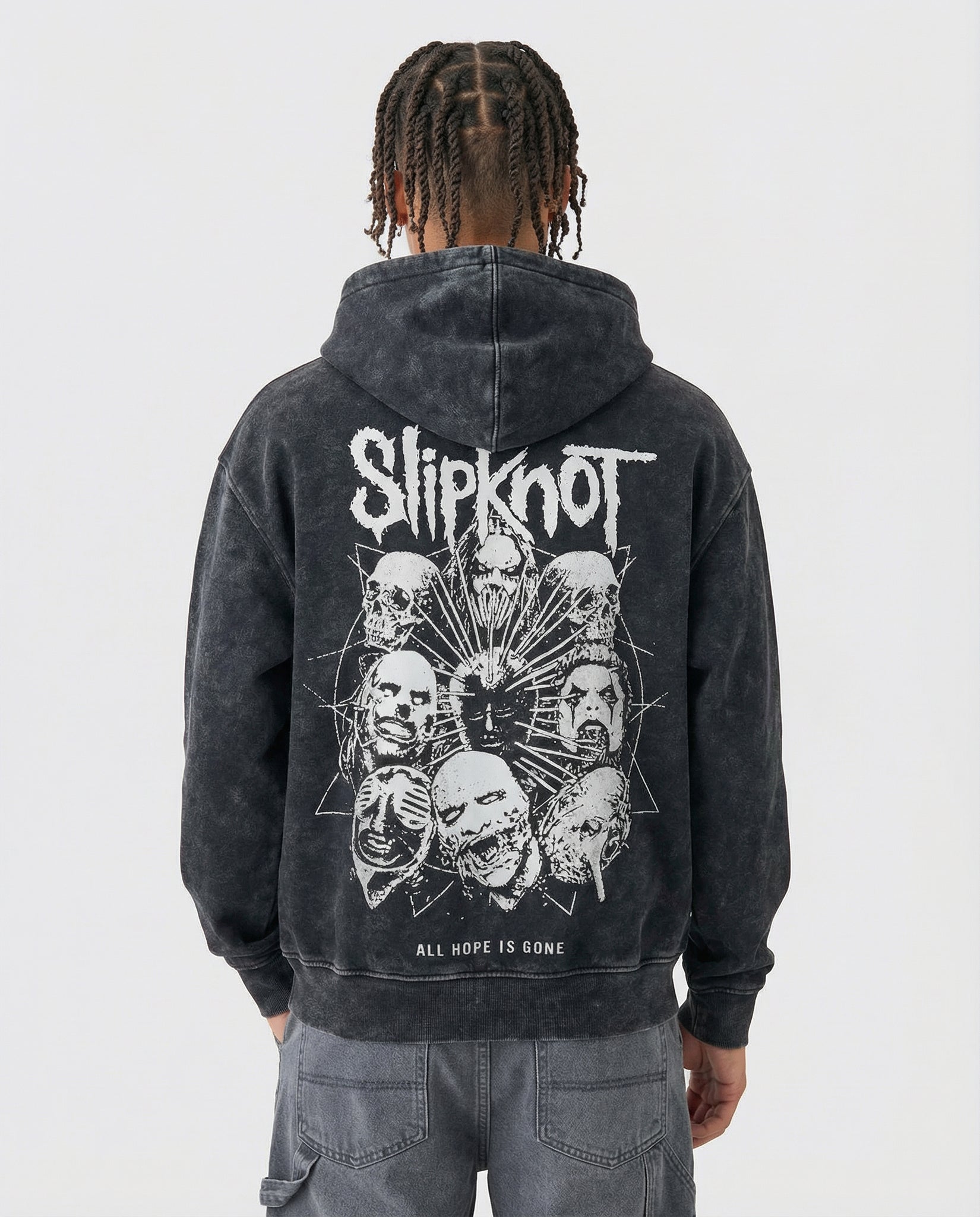 The front stays silent, the back erupts, mirroring the calm-before-collapse energy of Slipknot.